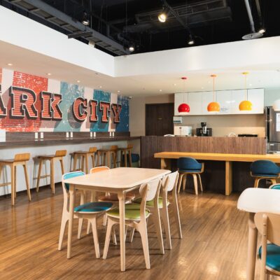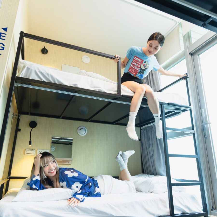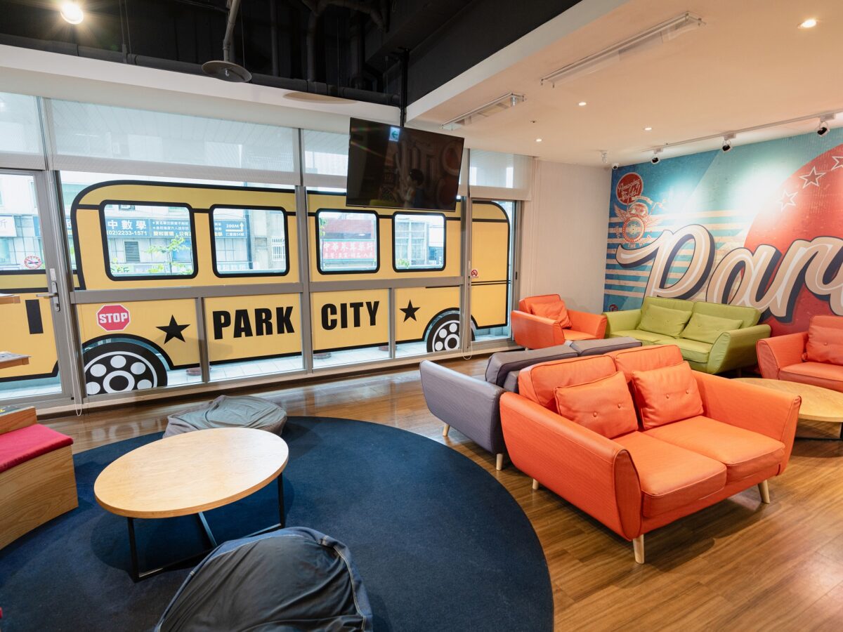 以『美式校園宿舍風』為主題,活潑的品牌字體搭配多彩用色,使交誼廳顯得更有活力與趣味,舒適沙發區,享受悠閒時光,讓來自世界各地的旅客,能在這個空間放鬆心情、自在交流,分享旅行的美好記憶。